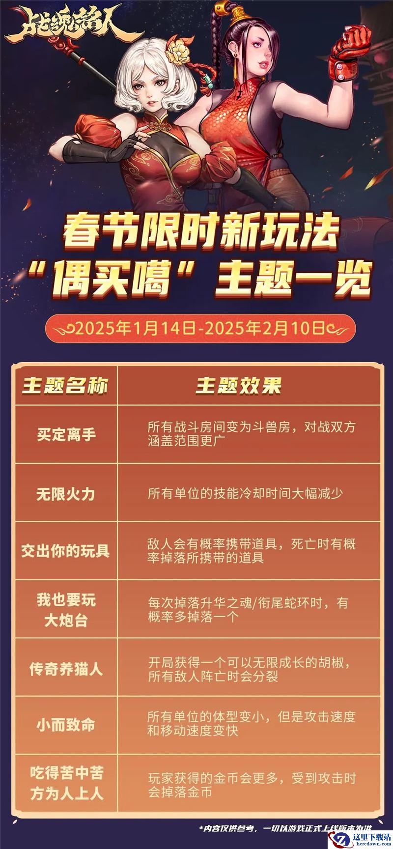 春节限时活动将在2025年1月14日至2月10日期间进行,玩家需要更新到v2.7.0版本,并保持联网状态。活动内容包括【战魂自走棋】和新增玩法【偶买噶】。偶买噶地具体玩法和规则尚未详细说明,但可以期待其带来的新体验。官方每天都会更新一个主题,共有七种主题有序轮换等待玩家来挑战。