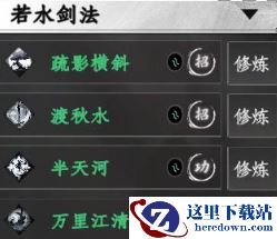 若水剑法是江湖上常见的剑法,由许多江湖中人一招一式磨练而来,易上手,易贯通,广泛分布在江湖人士间,拥有2个招式,1个功体,1个秘技。