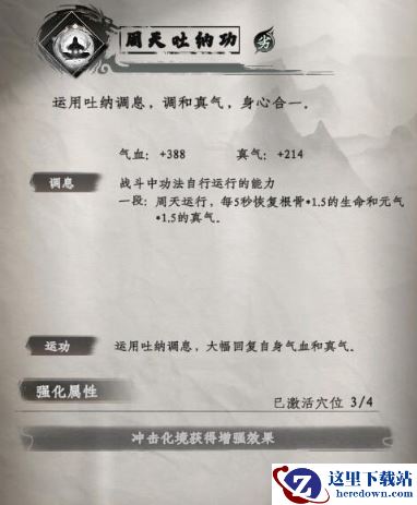 周天吐纳功是玩家入门功体之一,能提供基本的气血真气恢复能力。