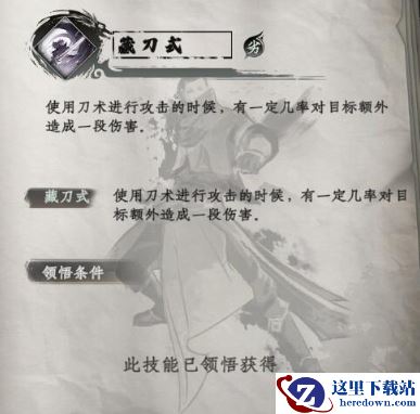 秘技属性-隐刀术:使用刀法攻击时,有一定几率对敌人造成一段额外伤害。