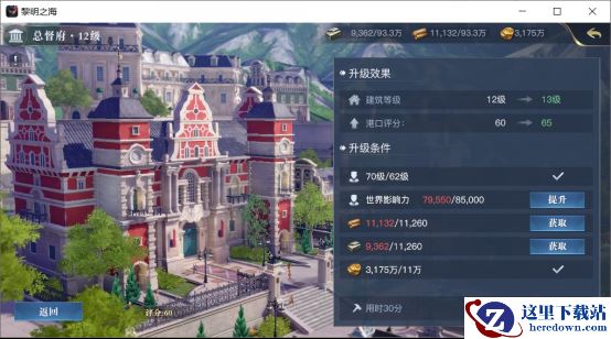 而总督府的升级条件,需要原木、石料、贸易币以及世界影响力。前两者是自建港的专属资源,下面会讲。一般情况下,总督府的等级都是卡在世界影响力和贸易币上的。而这两个条件,其实本质是一个。因为世界影响力的提升方法,就是解锁更多码头、港口投资以及击败海域霸主,其中港口投资是真正的大头,非常消耗贸易币。
