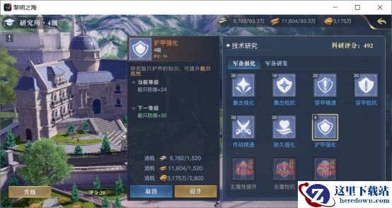 研究所的升级优先度也非常高,消耗原木与石料强化军备,直接给船只提高属性。