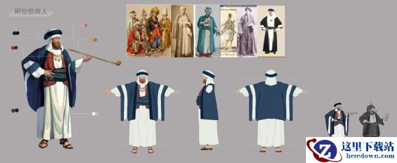 有别于欧洲商人,我们在阿拉伯的商人的设计上,除了为他设计了阿拉伯特有的宽敞服饰以及包裹白色的头巾之外,还在鞋子的设计上进行了更多的考虑。比如说,我们在设计阿拉伯的码头官员,酒馆老板甚至是男性居民的时候,都采用了具有他们传统特色的尖头鞋设计,而对于男性商人,我们的考虑是,虽然阿拉伯商人也会乘船航行,但是在大航海时代之前,他们经常需要进行陆上贸易,时常走动。长年累月下来,这些商人可能依然习惯性得穿凉鞋经商。