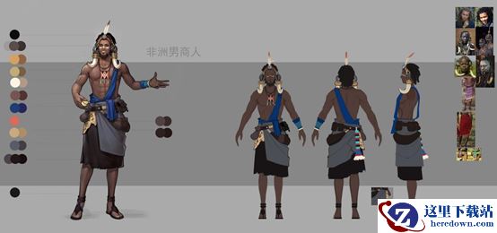 在设计非洲商人时,除了肤色,我们希望通过一些细节的地方凸显他的职业。比如兽皮制成的腰包,以及隐约漏出来一角的豹皮裙。这些可能在现代人看来比较具有土著气息,但在当时的非洲,这就是象征身份的一种装饰。