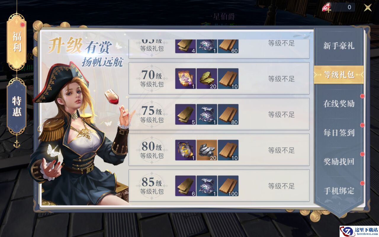 等级礼包是《黎明之海》游戏中最基础的成长类奖励,我们每到10、20、30、35、40、45、50、55、60、65、70、75、80、85级时,均可领取一次相应等级的奖励。礼包里分别有木材、魂石、矿石、藏宝图、皇家招募信、装备设计图等重要资源,我们的等级越高,礼包内的奖励就越丰富。