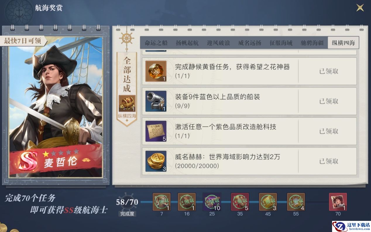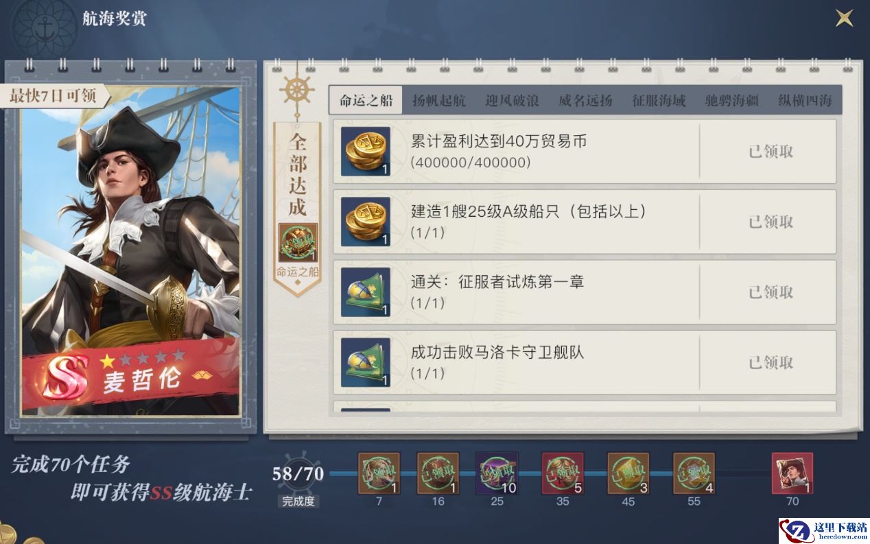 当我们累计完成7、16、25、35、45、55个子任务后,还可额外获得S级航海士招募信、音乐家职位证、紫色魂石、45级传奇造船材料、橙色魂石和S级航海士碎片这些珍稀好礼,完成全部70个子任务后更是能获得SS级航海士麦哲伦的招募信,最快七日可获得全部奖励。