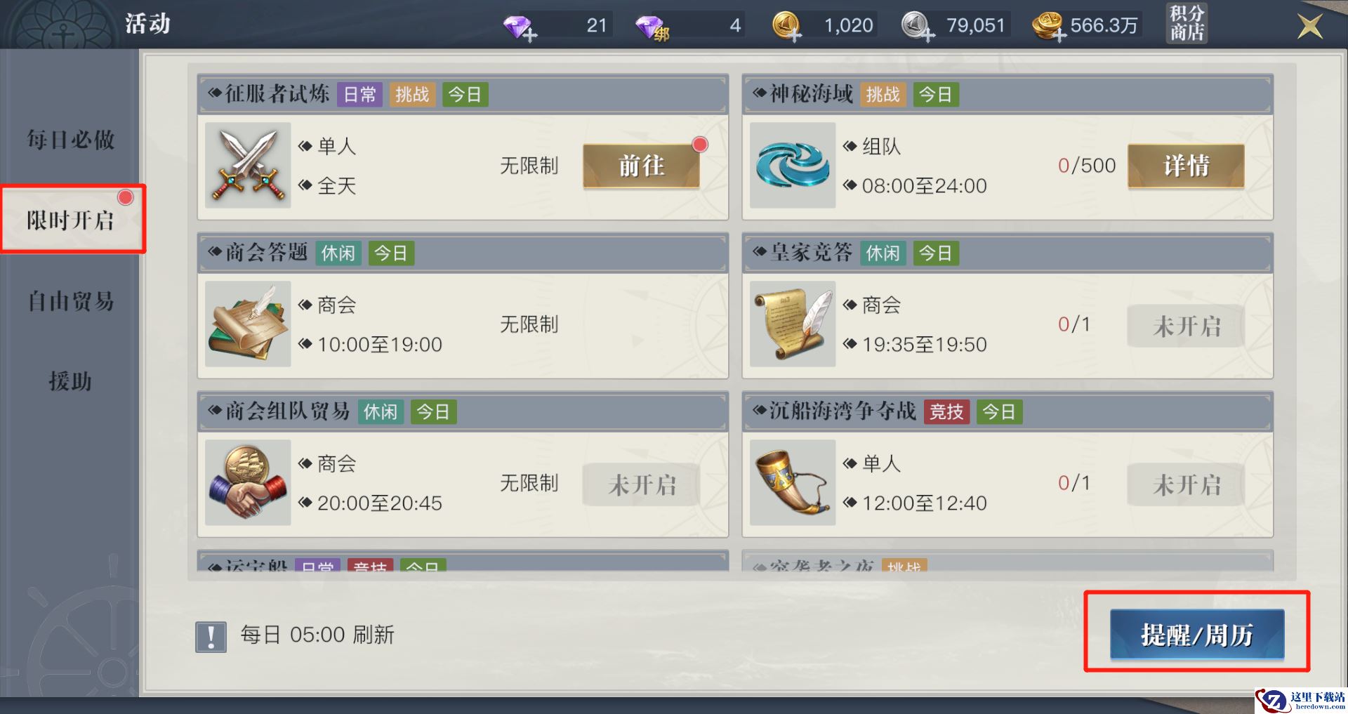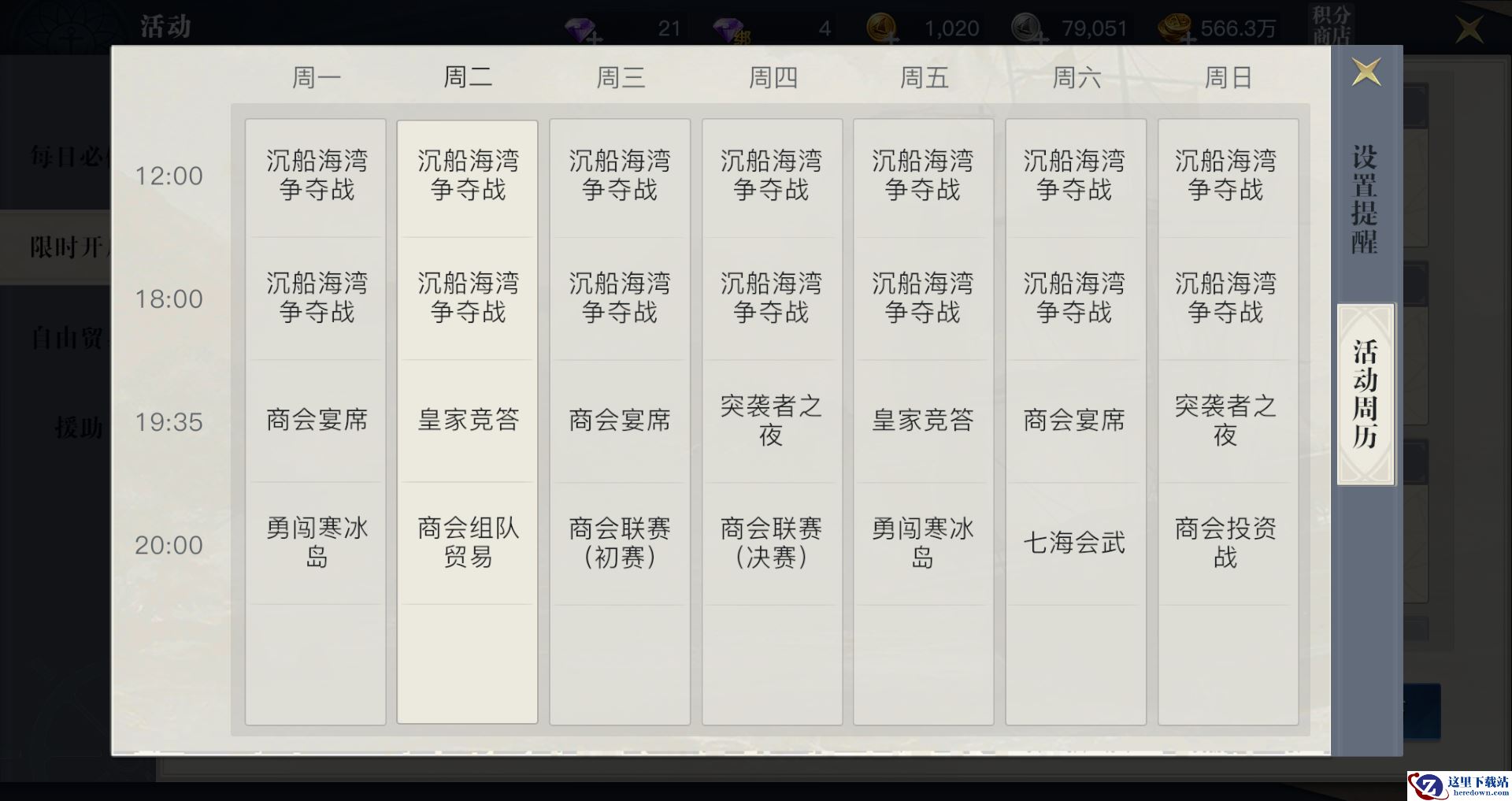 我们可以在限时开启中找到活动周历,查看每天活动,方便新手玩家熟悉活动时间,合理安排时间参加活动。