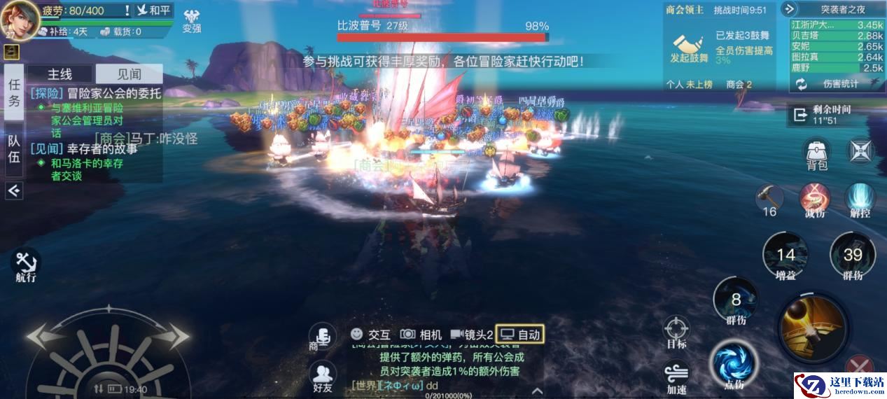 活动期间需要全体商会成员全力输出BOSS,与其他会员争夺伤害榜的名次。难度不高,可以挂机完成也可以手动操作。在打完BOSS后系统对所有会员造成伤害进行排名,并且商会打BOSS的速度也将进行排名,最后根据排名发放奖励。