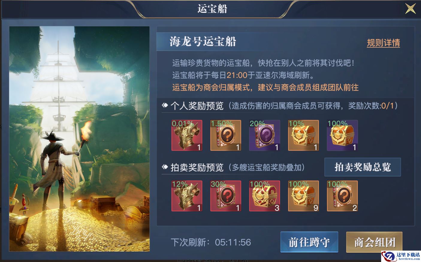 我们可以在每天20:45~21:30准点在亚速尔海域与商会成员一起参与运宝船。每天击败宝船可以获得一次个人奖励有机会开出技能书、装备、船只技能等稀有物品。