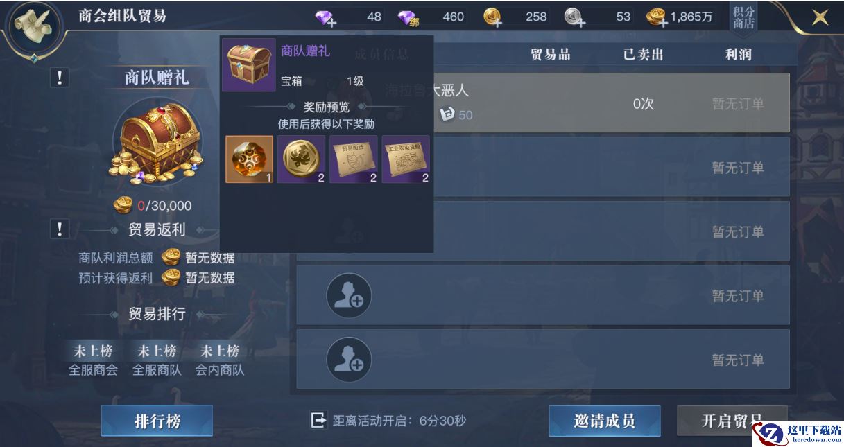 与商会成员组建商队在十五分钟内尽可能贸易五种系统制定物品达到高的贸易额,最终根据贸易额排名,系统会发放商队奖励以及商会排名奖励。奖励包括黄色船舱图纸、商贡、命运石、商会投资券等。