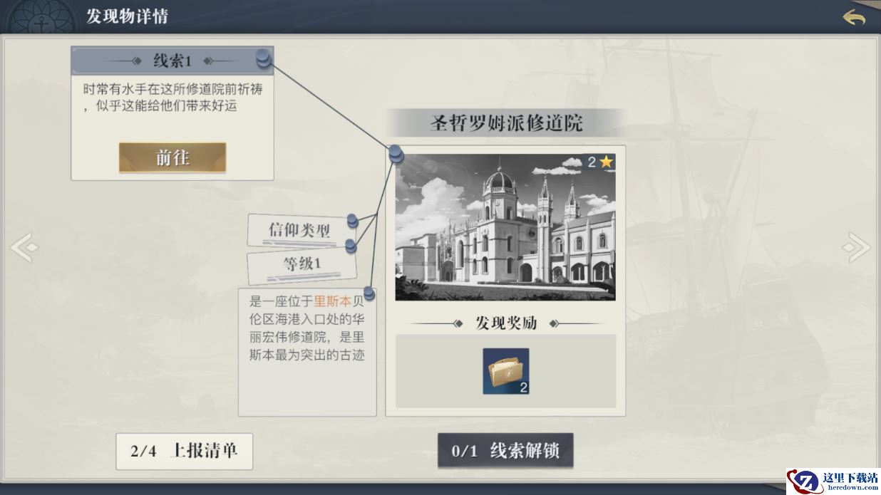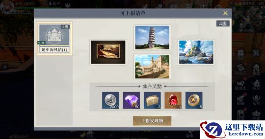 当找到所有发现物,我们点击“上报发现物”就会自行前往“塞维利亚”收藏家爱德华处,完成上报后即可获得研究资料、绑钻、银币、皇家招募券、探险币等奖励,奖励珍贵程度与上报清单星级成正比,上报清单星级越高奖励也越高,推荐大家将能收集上报的清单都集齐上报,奖励还是很香的。