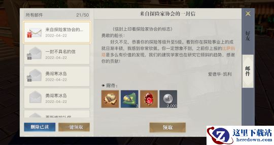 除了解锁发现物获取研究资料外,玩家在使用研究资料提升探险等级后,也可以获取一系列丰富的奖励。需要注意的是,升级了探险等级后,不会直接获得探险声望函,而是会收到一份邮件,在邮件中可以领取探险声望函、爵位证书(洗炼爵位属性)以及星辰秘宝(用于灌注秘宝)。
