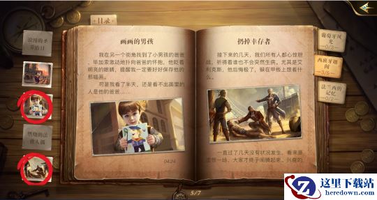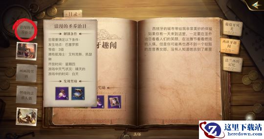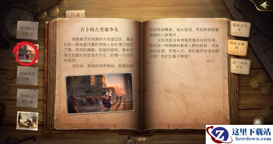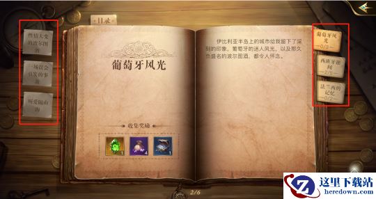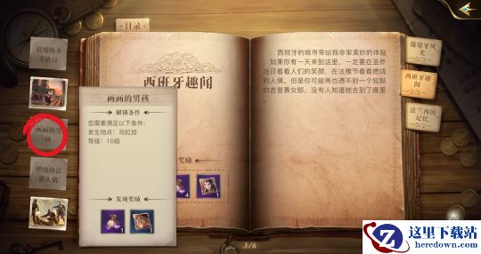 当我们进入书本目录界面后,可通过右侧书签选择书中见闻分类,可通过左侧图标选择单独见闻,书本正中能查看该分类见闻集齐后可领取的奖励。