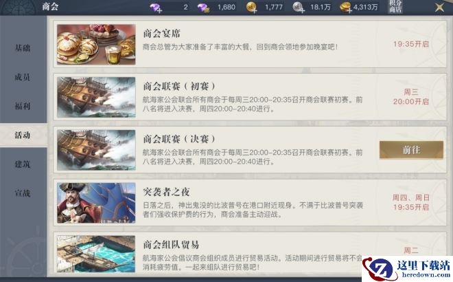 商会每日都会开启大量活动,如运宝船、皇家竞答和商会答题。周一、周二、周三、周四及周末还会额外开启商会宴席、商会组队贸易、商会联赛、突袭者之夜及商会投资战活动。