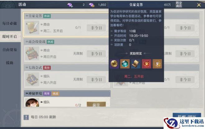 为了促进科学研究的良好氛围,英国皇家学会每周二、周五晚上都会举办皇家竞答活动,参赛者都可以获得丰富奖励,其中就包括地中海藏宝图。对自己学识有自信的冒险家们都可以前来参加,回答正确后即可获得奖励。皇家竞答活动中的问题十分简单,非常推荐大家在周