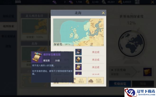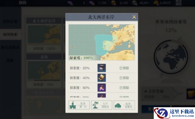 探索系统中可以领取大量地中海藏宝图,但是获取的过程较为漫长。我们每到达一个新港口、探索点及迷雾点后均可提升当前地图的探索度,每个地图累计探索度到达40%后都会奖励一张地中海藏宝图。我们可以在升级与探险的途中不断积累探索度,并领取丰富好礼。