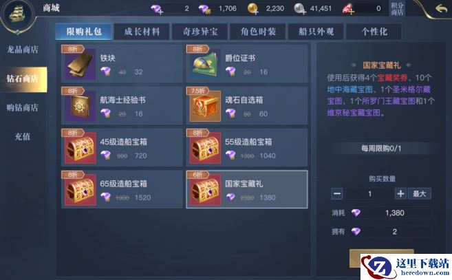 在商场充值购买也是一种快速获得各种资源的方法。其中,地中海藏宝图可以在钻石商店中通过购买国家宝藏礼获得。国家宝藏礼包的价格为1380钻,每周限购1个,使用后可获得4个国家宝藏奖券、10个地中海藏宝图以及三张不同的紫色藏宝图,我们可以根据自身情况酌情购买。