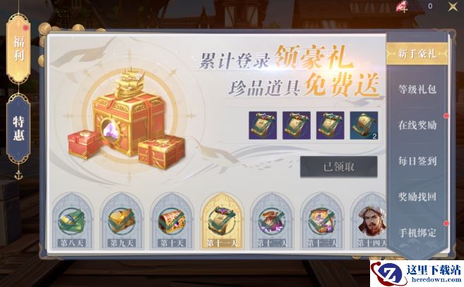 新手豪礼是最简单的获取地中海藏宝图的途径之一。我们每次新建游戏角色都可以获得一份新手豪礼,能够连续领取十四天的丰富资源。其中第4、第8、第11天的礼包内均包含两张地中海藏宝图,非常推荐大家每日领取。