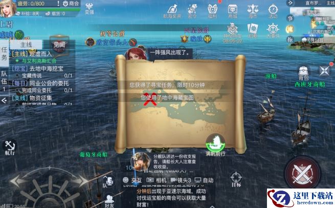 我们可以在包中点击并使用地中海藏宝图,使用后将会接取一个限时10分钟的寻宝任务,并给我们一张寻宝地图。我们可以根据寻宝图指示的方位来到海域中相同的位置进行寻宝,也可以交由电脑自动寻路挂机完成。完成寻宝后可以获得银币、紫色船首帆图纸、紫色船甲图纸、紫色魂石等丰厚奖励,非常推荐大家在空闲时挂机完成。