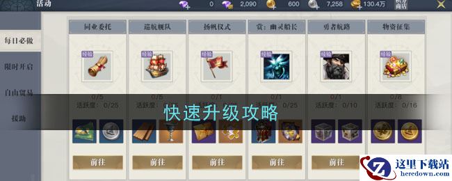 活动里每日可获得经验值的包括 :“同业委托”、“巡航舰队”、“扬帆仪式”等日常活动,我们一起看看哪些是升级一定要完成的吧!