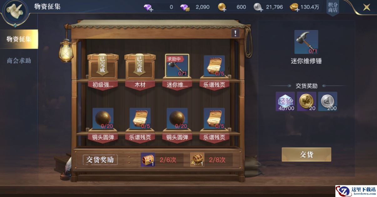 任务是向自己的商会上交所需的货物以此获取经验,每天上线只需动动自己的“金手指”,点一点上交就能获得经验值。交货6次就可以开启普通宝箱(商会贡献度和铁块),全部完成8次开启完美宝箱(商会贡献度、紫色魂石、希望之花碎片)并且获得16活跃度。