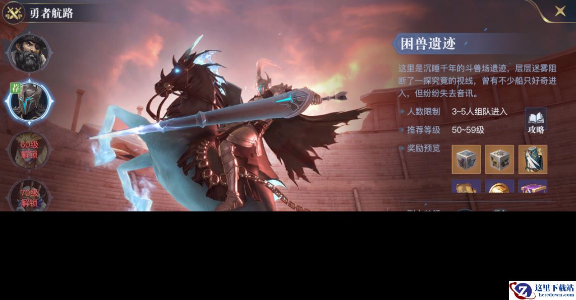 勇者航路中包含四大副本,分别为34级燃烧港湾、50级困兽遗迹、60级战栗仙境、70级冰海领主。打完普通难度后可解锁困难,获得的奖励与等级和副本难度挂钩,副本完成后可获得大量经验值、船装、套装、装备设计图、魂石、装备碎片以及10活跃度。