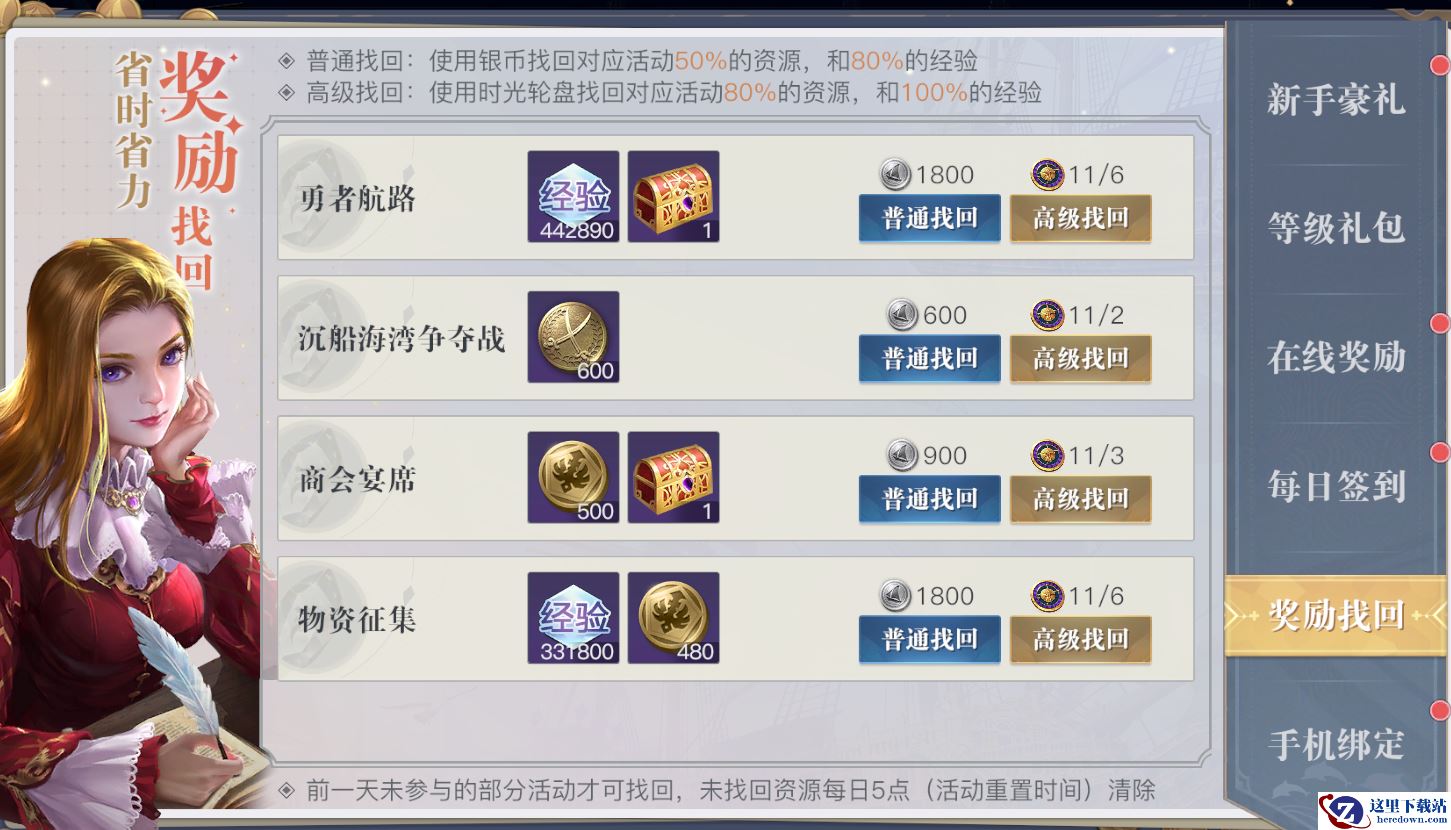 普通找回:使用银币,找回对应活动50%的资源和80%的经验。