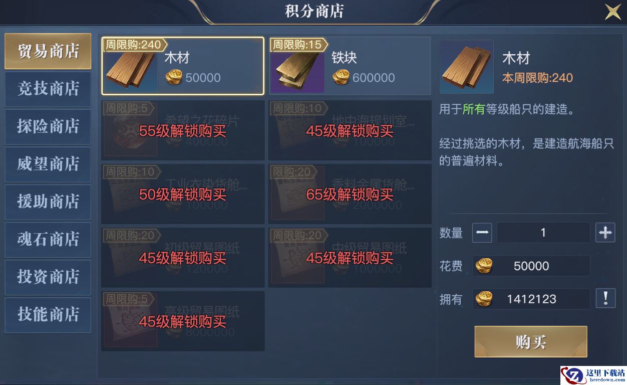 在贸易商店内可以花费5万贸易币购买木材,每周限购240个。