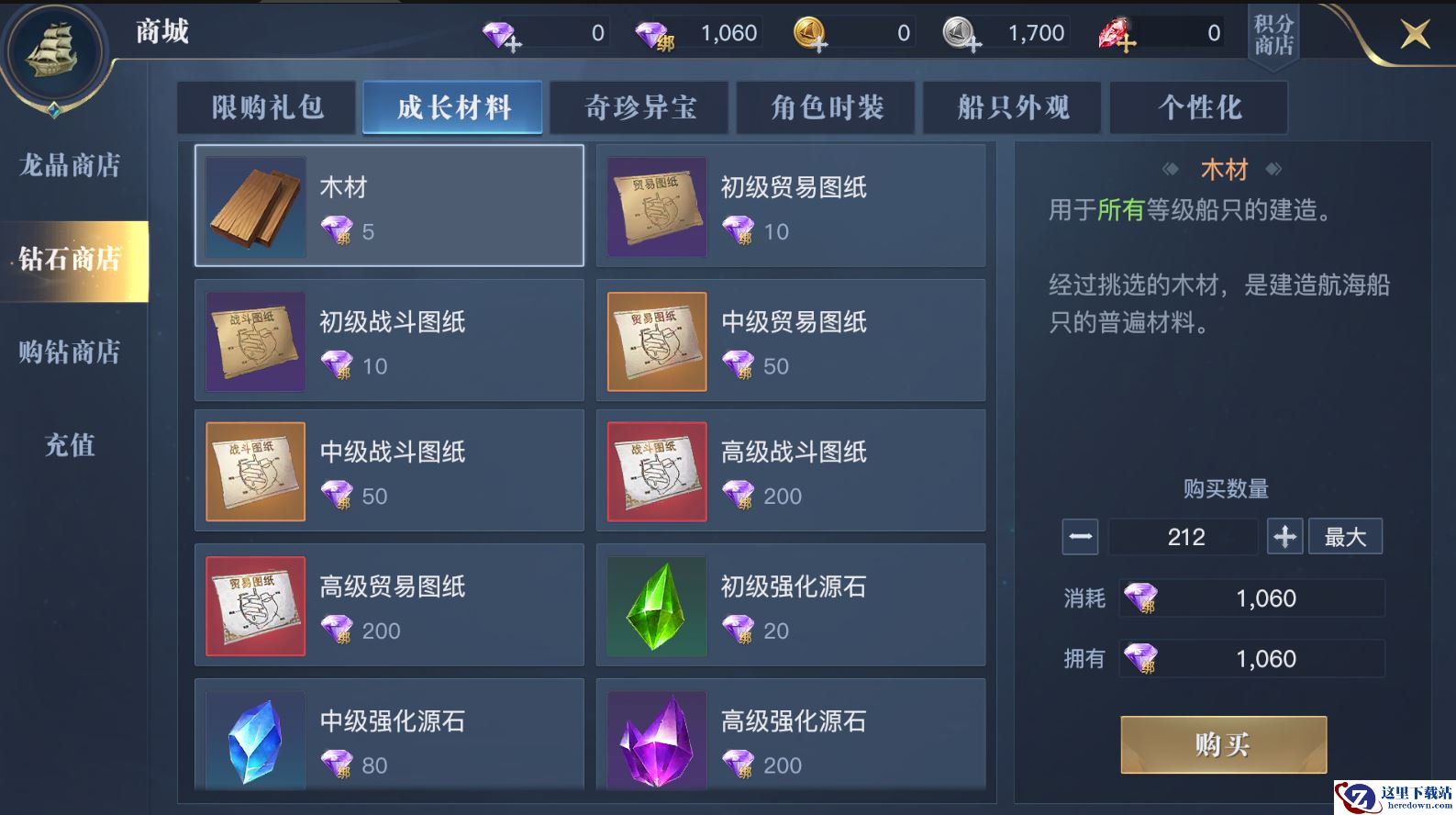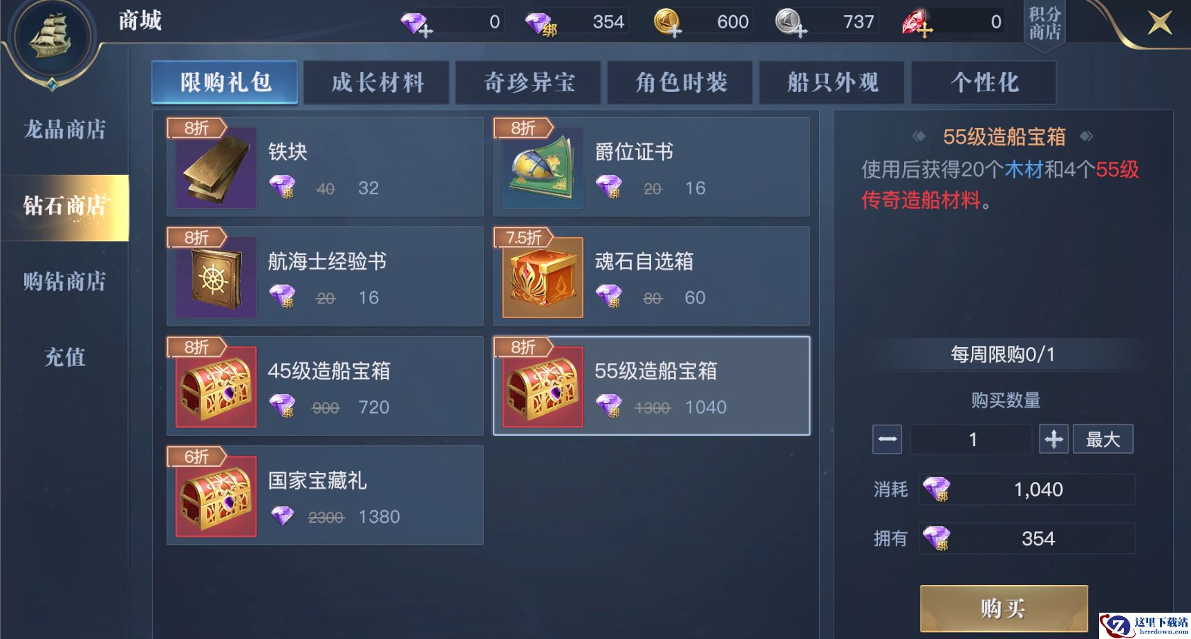 钻石商城限购礼包分栏中有对应等级的造船宝箱,开启后可获取相应等级的传奇造船材料。(每周限购一次)