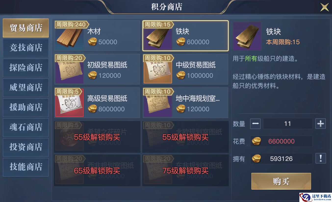 在贸易商店内可以花费60万贸易币购买铁块,每周限购15块。