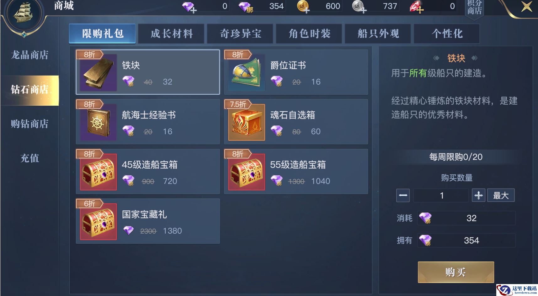 在钻石商店中可以花费32个砖石购买铁块,每周限购20块。