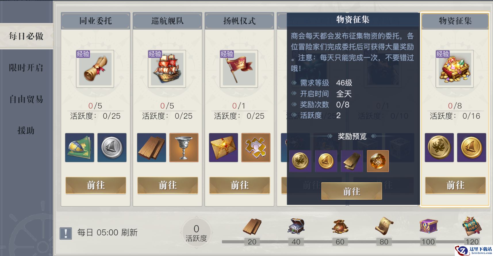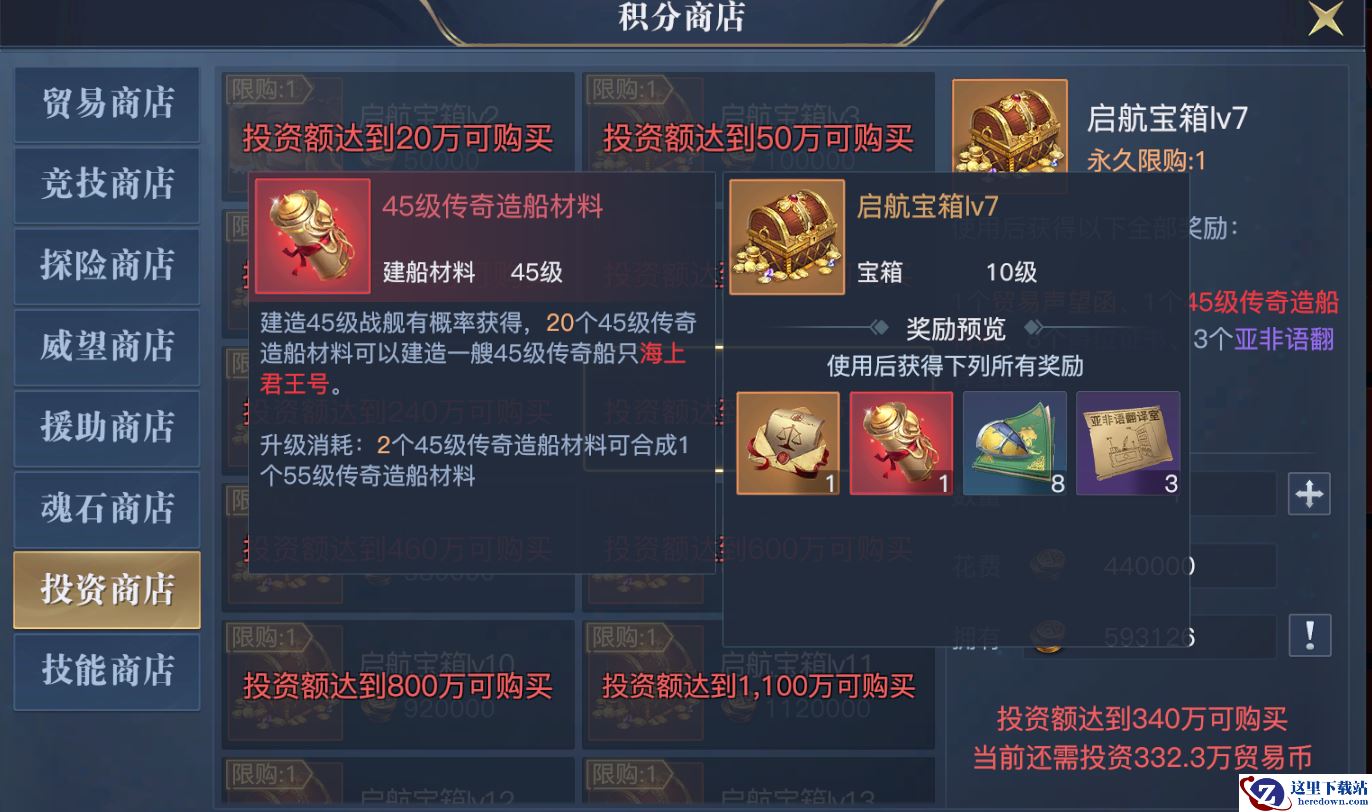 当投资额度达到要求时可以花费贸易币购买相应的启航宝箱,开启宝箱可获得传奇造船材料,限购一次。