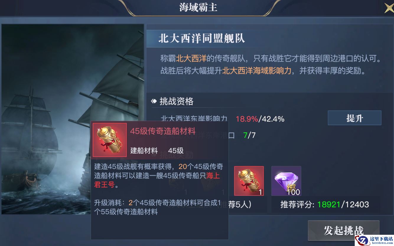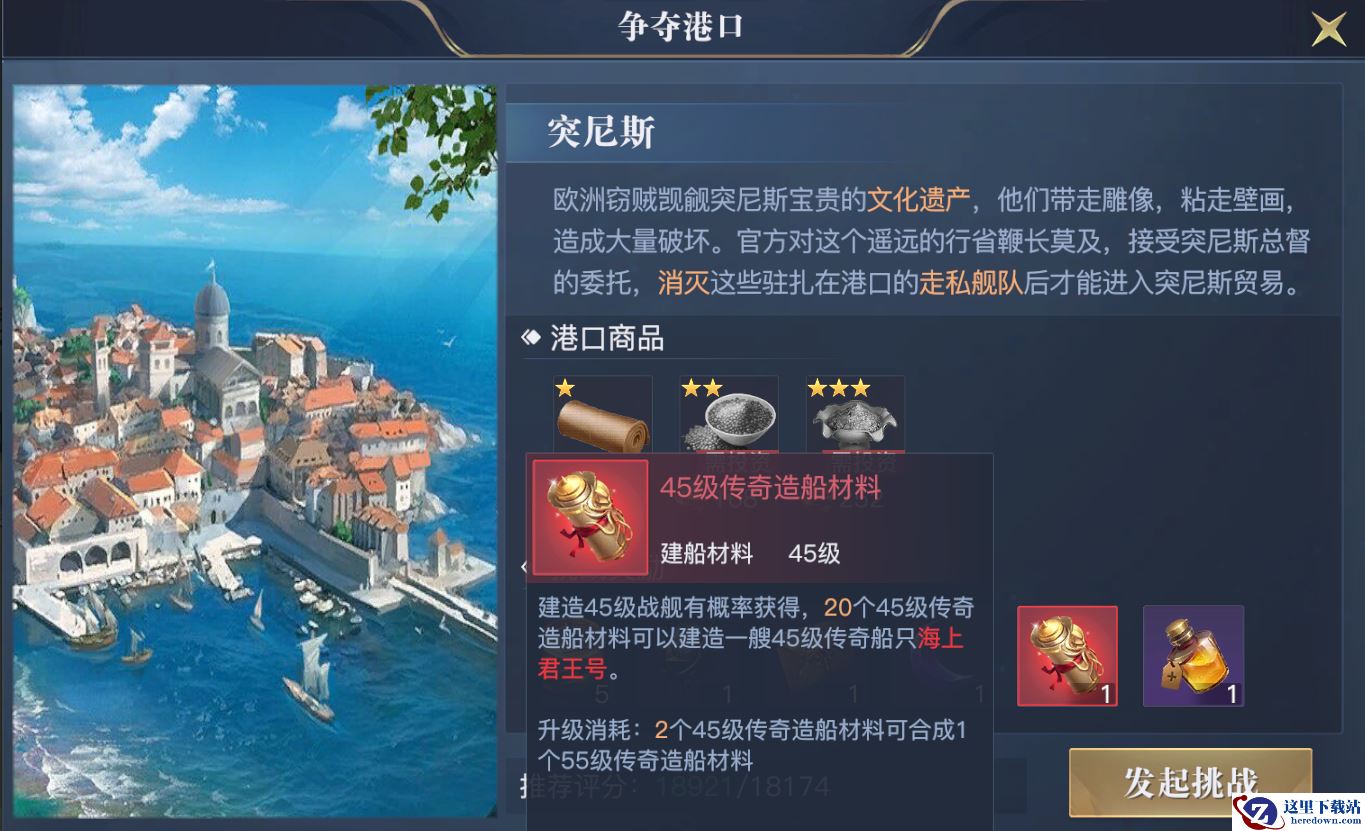 当战斗力达到挑战要求后,可以通过地图中争夺标识,挑战港口成功后可以获得传奇造船材料。