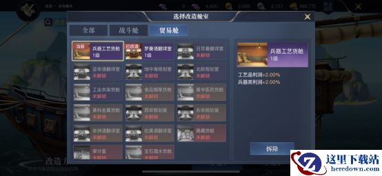 我们在建造船只以后,需要在船舱进行改造,这里的改造可以分为战斗和贸易两种舰队。战斗舰队的船舱改造可以增加各项战斗性能,比如高级火炮舱,可以增加船只高额攻击力;像医疗室则是增加船只受到的治疗效果属性加成,根据职业的需求,我们可以自由搭配。贸易舱可以增加交易属性,比如兵器工艺货舱,可以增加工艺品和兵器类物品的利润;而食品烟草舱则增加食品类和嗜好品类的利润,通过这些属性加成,贸易能力可以大幅度提升。