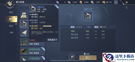 其次是精工,精工是对船装进行强化,以便提高船装增加的属性,当我们对单独部位的船装进行精工三次,即可进行升阶,进一步提升船装的属性加成。这里需要注意,我们在船装精工时,需要根据角色定位进行选择,比如输出职业重炮或弹药学家,优先精工船上增加攻击、暴击和穿甲的炮口,这样输出会比较高。像防御型职业,则优先精工增加耐久、防御、各种抵抗等属性的船装,也船只生存能力更强。