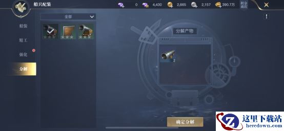 最后是分解,我们多余的船装要怎么使用呢?可以放到分解这里,将其变成同类船装精工的部件,用来精工需要加强的船装。这里一定要注意,只分解多余出来的船装,一定不要为了追求某件船装的极致属性,而将装备的船装卸下拿去分解,这样可就得不偿失了。