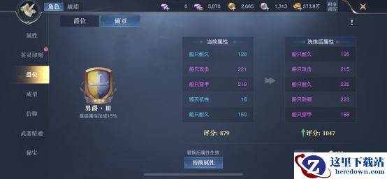 爵位的玩法里分爵位和勋章,爵位可以通过战斗、贸易和探险等声望来提升等级。爵位的等级高低决定了对勋章属性加成的比例,比如男爵三,可以对勋章提供15%的属性加成。勋章通过爵位证书的洗练,可以获取更好的属性。游戏前期,勋章属性以评分为主,评分越高越好。在游戏中后期,再侧重选择船坚、炮利和角色所需要的属性。威望则是游戏里荣誉的象征,威望勋章不仅可以给角色佩戴,还能获得对应的属性加成,我们可以通过【神秘海域】、【沉船海湾争夺战】中获取威名,当威名到达一定数量时,可以进阶获取对应的勋章和徽章奖励。