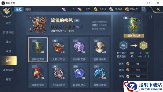 信仰之力,虽然是角色玩法,但主要加成的都是船只战力。主要消耗的是商会贡献与银币,每个神明祈祷五次进阶到下一个阶段。