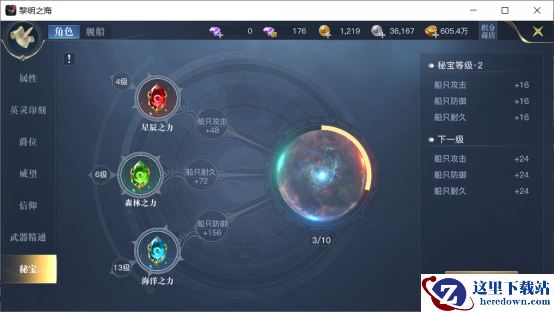 秘宝收集,是通过星辰之力、森林之力、海洋之力三种秘宝来提升船只属性的玩法。