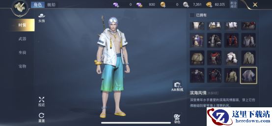 角色的装饰可以从时装、武器、宠物和坐骑方面着手,先来了解一下时装。时装是角色外面穿戴的服饰,所谓人靠衣装,马靠鞍,不管捏脸多好看,都需要用外观来进行搭配。比如【黑帆】时装,独眼海盗的风格,画面感满满,获取也比较容易,游戏公测时官网预约即可获得。还有【滨海风情】时装,凉爽的夏日风,驾驶着船只航行在海上,享受清爽的风。获取方面,可以从钓鱼商店中直接购买。