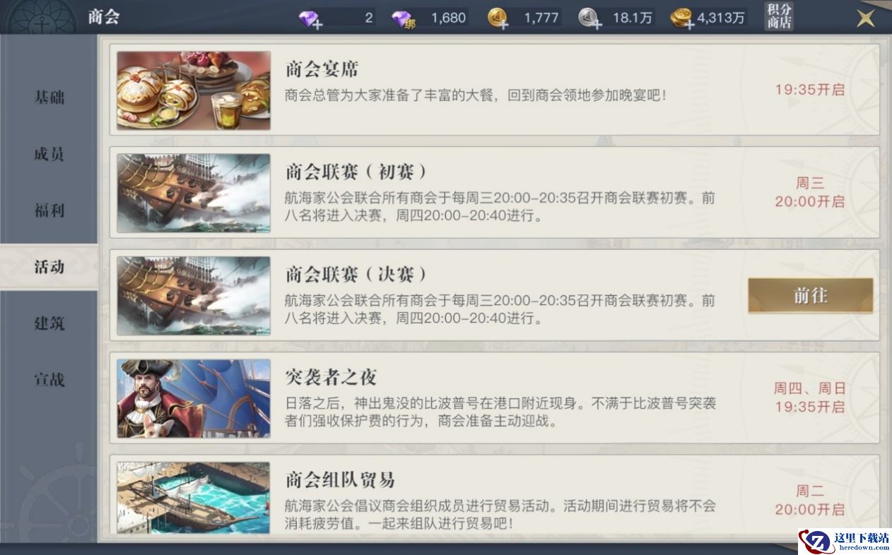 商会每日都会开启大量活动,如运宝船、皇家竞答和商会答题。周一、周二、周三、周四及周末还有额外开启商会宴席、商会组队贸易、商会联赛、突袭者之夜及商会投资战活动。