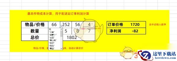 如图所示,在物品/价格一行,每个格子都设置了下拉选项,选择对应物品就会出现价格;数量一行依然是下拉选项。