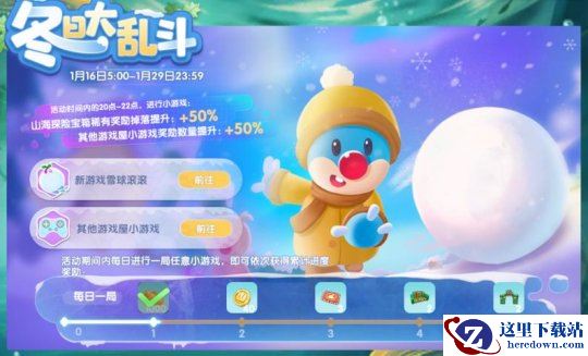 随着雪球滚滚上线,1月16日5:00-1月29日23:59会开启精彩的冬日大乱斗活动!活动期间的每天20点-22点,参与寻宝探险获得稀有道具的概率会提升,其他小游戏的奖励也会翻倍!