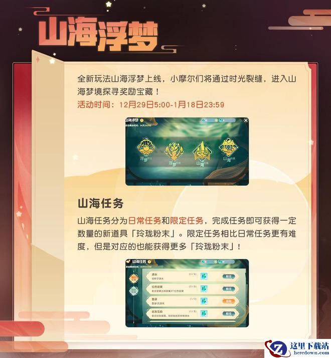 1、摩尔庄园山海浮梦完成山海任务可以获取玲珑粉末,每日任务5:00刷新,完成任务后记得领取奖励,未领取的每日任务奖励不会保留至第二天。