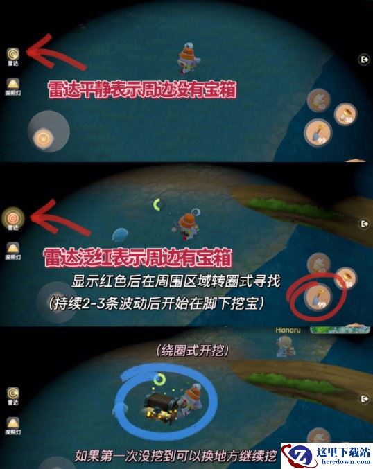 4、雷达频繁发出红色波动!表示宝箱就在附近,可以在脚下用铲子进行挖宝。