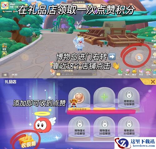 2、博物岛进门右转,靠近蓝绿色店铺点击。