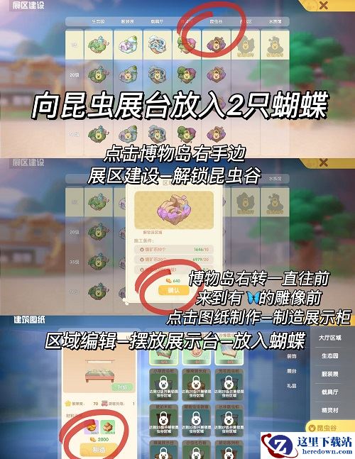 2、点击博物岛右手边,展区建设一解锁昆虫谷。