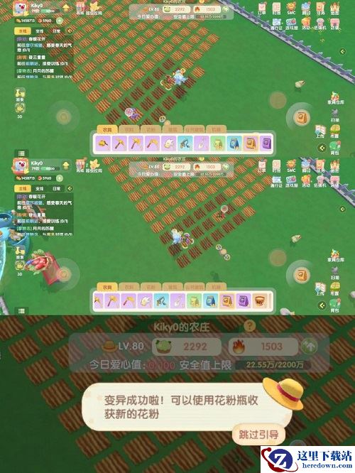 2、种植—使用高级肥料快速成长—植物头顶上出现花粉瓶—点击农具(花粉瓶)获取花粉—再点击(花粉)使用不同颜色的花粉授粉—高级肥料快速成长—植物成熟(变异成功)