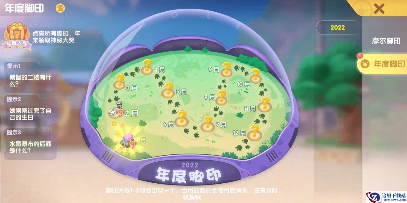 摩尔年度脚印系统上线啦!小摩尔在完成前置任务解锁年度脚印后,就可以通过任务查看每个月的脚印线索啦!