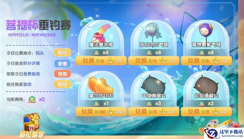 小摩尔们在钓鱼比赛中,钓到不同的鱼可以获得不同的钓鱼积分,同品种的鱼,重量越高积分越高哦。钓鱼积分兑换钓客徽章还可以兑换小礼物。快来试试吧~